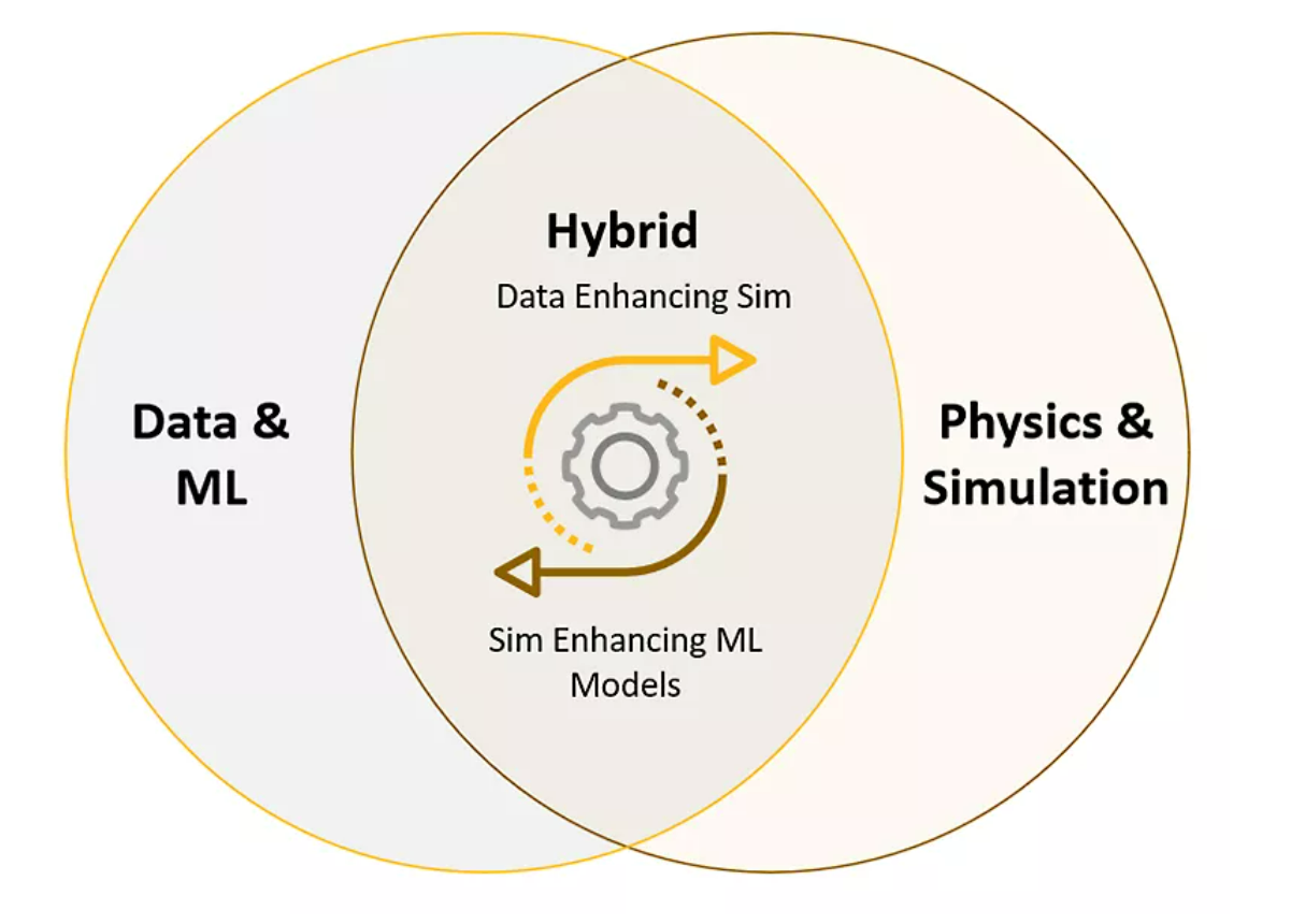 A hybrid digital twin embodies a synergy between data and simulation where the simulation provides more data for data models. In contrast, sensor data from the field teaches the model about operational performance.
