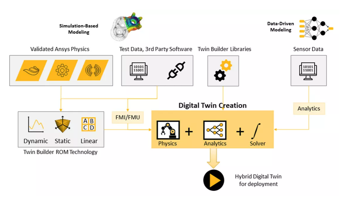 A hybrid digital twin originates during design, utilizing design models to capture intent and specs. Reduced Order Modeling (ROM) technology enables complex CFD and FEA models for real-time applications, broadening possibilities for complex systems.