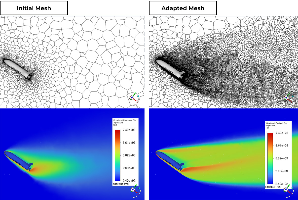PUMA with Hessian pre-defined parameters at Mach = 19 (right) shows advanced complexity and fidelity compared to the initial mesh. There is increased fidelity of the vibrational-electron temperature field in the wake due to presence of multiple shocks.