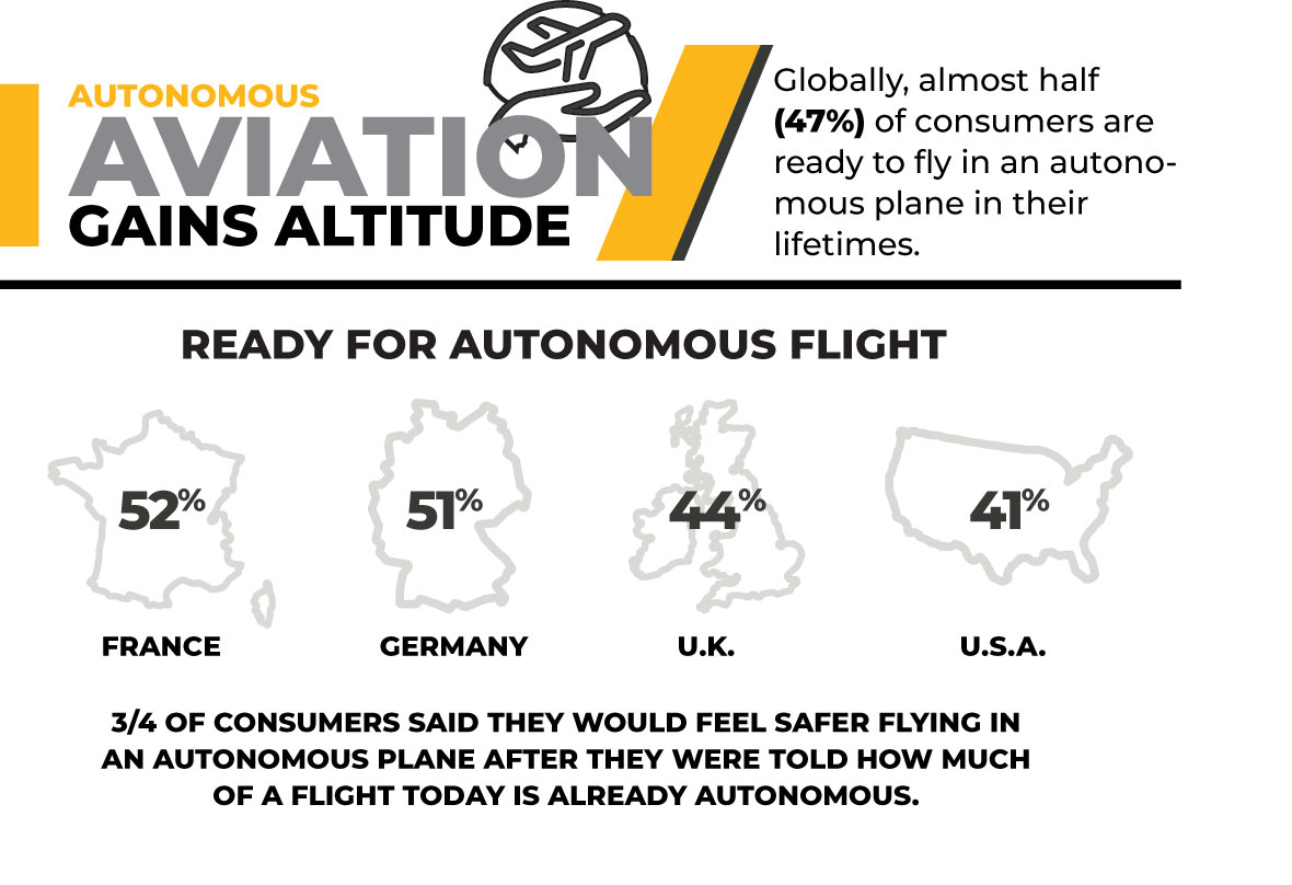 In total, 74% of respondents said this information changed their perception of the safety of autonomous flight. Forty percent of them said they were "shocked it’s not common knowledge that the vast majority of my last flight was likely autonomous.” The two most likely markets to say this were respondents from the U.K. (45%) and France (44%).