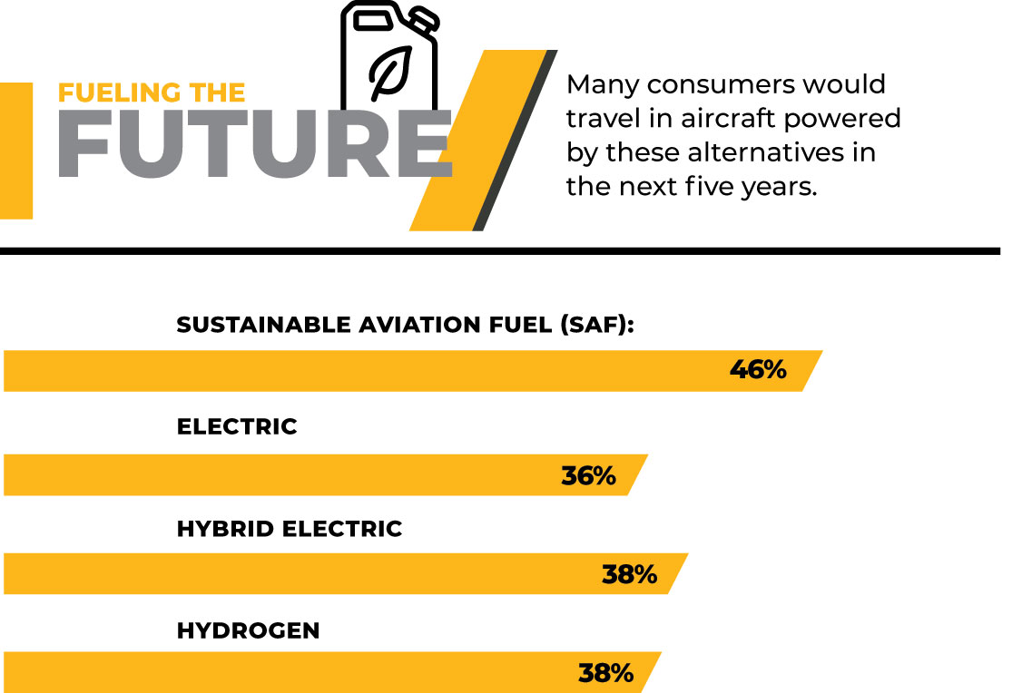 The majority of the public's sustainability concerns may bode well for new and emerging aircraft power sources — if they knew what those alternative power sources were. On average, 36% of respondents had never heard of sustainable aviation fuels (36%), electric-powered aircraft (35%), hybrid-electric aircraft (37%), or hydrogen-powered aircraft (37%).