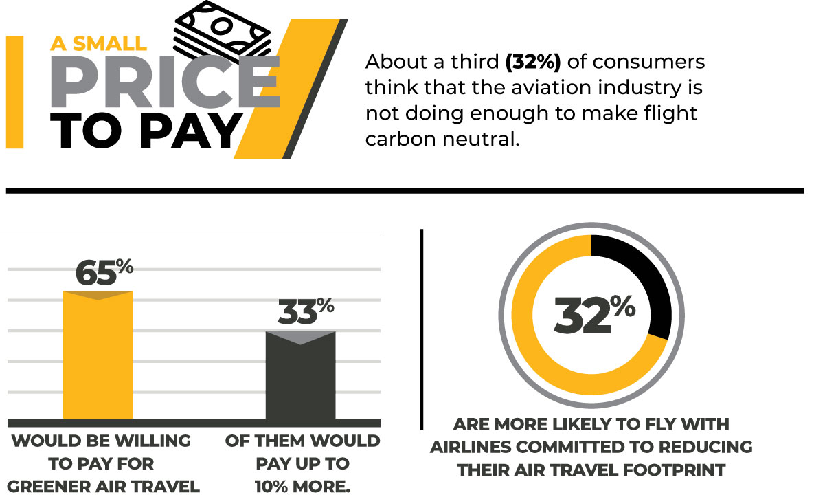 What does that mean for commercial flight bookings? It's a mixed bag, with half of those surveyed responding that one way they would lessen their carbon footprint is by reducing their air travel. On the plus side, 65% said they would be willing to pay for greener air travel.