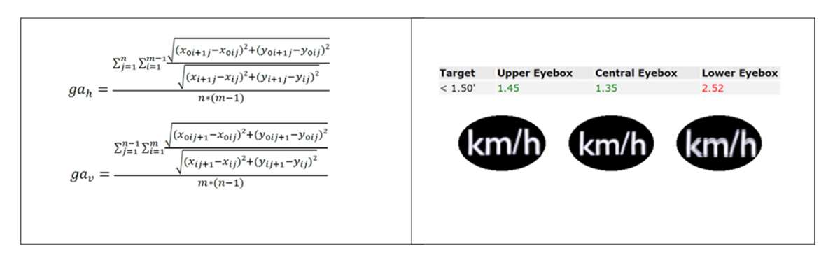 Figure 4. Traditional manual methods to check a design against requirements using complex optical metrics definitions (left). A head-up display (HUD) report in Ansys Speos, which uses customized plugins to easily check original equipment manufacturer (OEM) requirements as pass or fail tests (right).